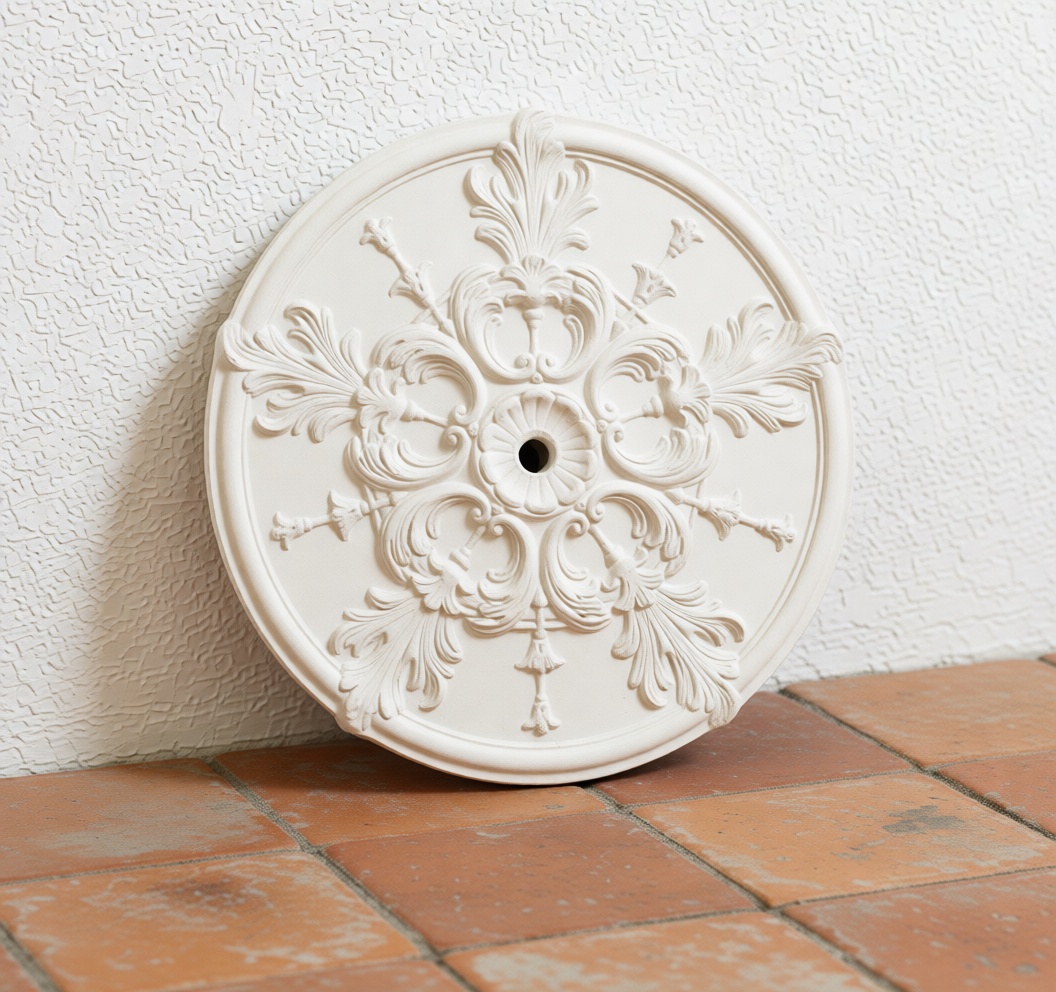 Ceiling Rose 1022 is designed in the Georgian Revival style, emphasizing simplicity, symmetry, and refined classical detailing. The shallow relief work offers a subtle decorative effect, making it ideal for interiors that prefer understated elegance over heavy ornamentation. Its clean and balanced design complements both traditional and transitional spaces, adding a touch of timeless sophistication without overpowering the ceiling.